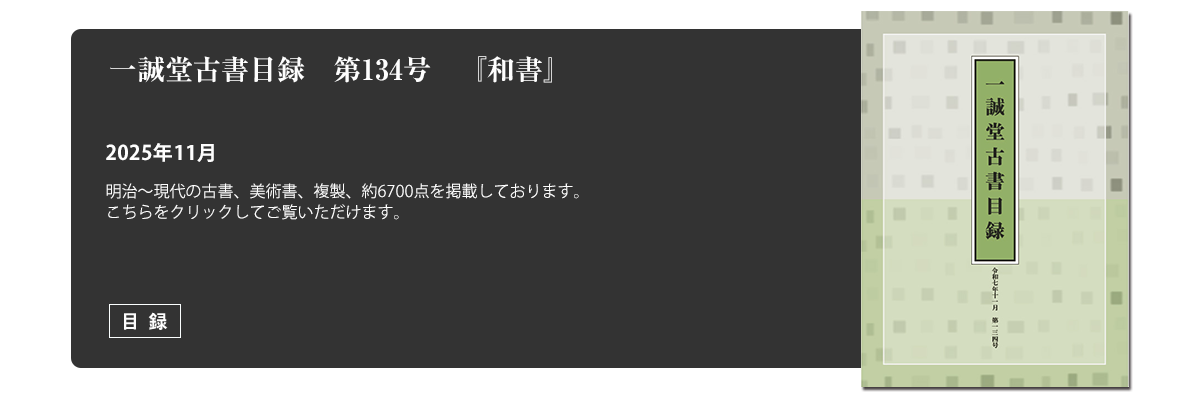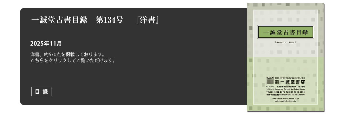 Home すべてのタグ タグ古代エジプト (204) 和本目録2025 (108) 西洋版画 (45) 辞書・文法書 (44) Loeb Classical Library (33) 西洋中世彩飾写本 (29) 俳諧 (29) 東西吉祥会2025 (28) 洋書目録65号 (27) ABAJ2024 (27) サンスクリット語 (26) 古写真 (24) 貨幣 (22) ISEAS (20) 地誌地図(江戸東京) (20) ジャイナ教 (19) 読本 (18) オーレル・スタイン (17) 北斎 (17) 天理図書館善本叢書 (16) Mountaineering (16) チリメン本 (16) 古代ギリシア語 (15) ゾロアスター教 (15) 小泉八雲/ラフカディオ・ハーン (15) 舞台芸術 (14) リグ・ヴェーダ (14) アール・デコ (13) ABAJ2024(和本) (13) 医学 (13) 源氏物語 (13) ペルシャ・イラン美術 (12) 地誌地図(世界) (12) 国芳 (12) 洒落本 (12) 古写経 (12) アール・ヌーヴォー (11) Wiener Studien zur Tibetologie und Buddhismuskunde (11) 歌舞伎 (11) 古筆切 (11) 新着情報 2025年12月01日 NEW! 【最新目録発行のお知らせ】 2025年09月26日 「美術小目録」発行のご案内 2025年07月15日 【夏季休業日のお知らせ】 2025年06月25日 「和本特集号」目録発行 2025年04月01日 即売会「東西吉祥会」お知らせ 2024年12月02日 【最新目録発行のお知らせ】 2024年06月24日 「和本特集号」目録発行 2023年06月01日 定休日変更のお知らせ