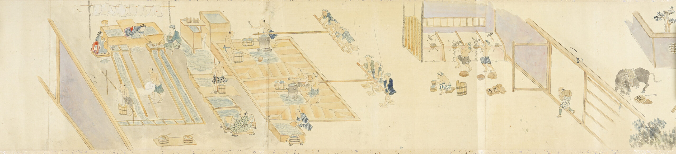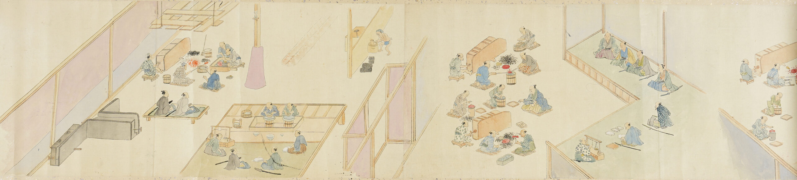 | 備考 | 本紙の紙高二六・七糎、一回り大きい紙で裏打を施し巻子に仕立てる。緞子表紙に金紙書題簽「佐州金山鑿穿之図」付。内題同じ。奥書なし。坑内図より始まり、鍛冶小屋、四留番所、鉱山町、金銀の勝場、銅の勝場、浜流、小判所、後藤座までの図を収める。なお西三川砂金山図はない。用具や人々の装いなどから江戸中後期の様子を描いたものと思われる。詞書の類はなく、筆彩色が施された絵図のみで構成されている。部分的に巻皺があるも虫食はなく、保存は良好。「佐州金山鑿穿之図/ 吉村蔵」の箱書がある古い桐箱に収まる。 |