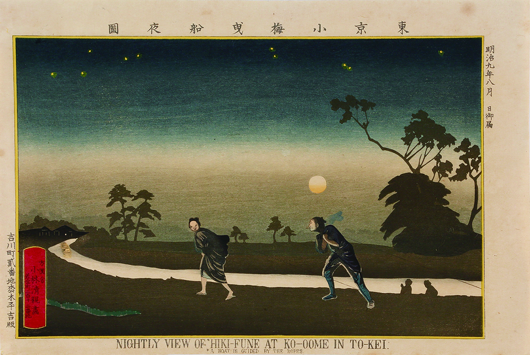 備考松木版のなかで最初に出版された五図のうちの一図。下部欄外には「NIGHTLY VIEW OF HIKI-FUNE AT KO-OOME IN TO-KEI./A BOAT IS GUIDED BY THE ROPES.」の英題が刻されている。
