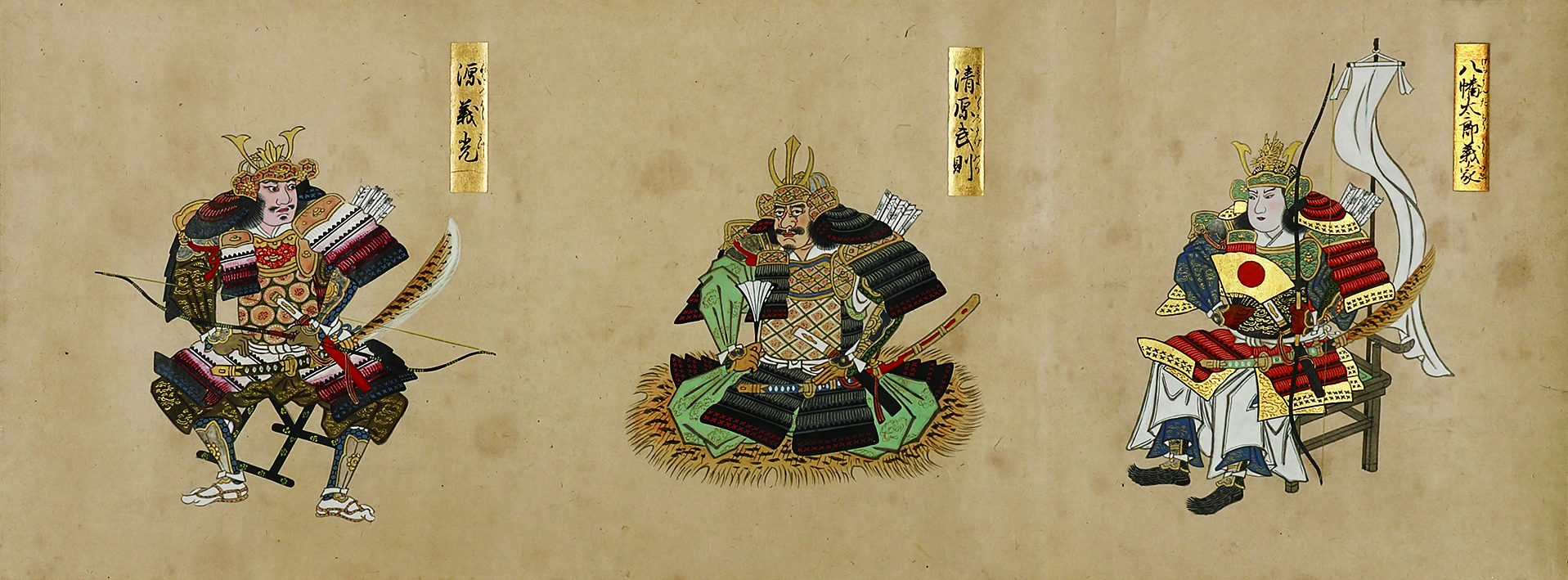 備考紙高三四・七糎。萌黄色地に牡丹唐草模様織の緞子表紙に銀紙元題簽「本朝百人武將 天(地・人)」(ヤケ)、金銀箔野毛散らしの見返しが付され、本文には裏面に金銀箔を散らした厚手の斐紙が用いられた上装。
