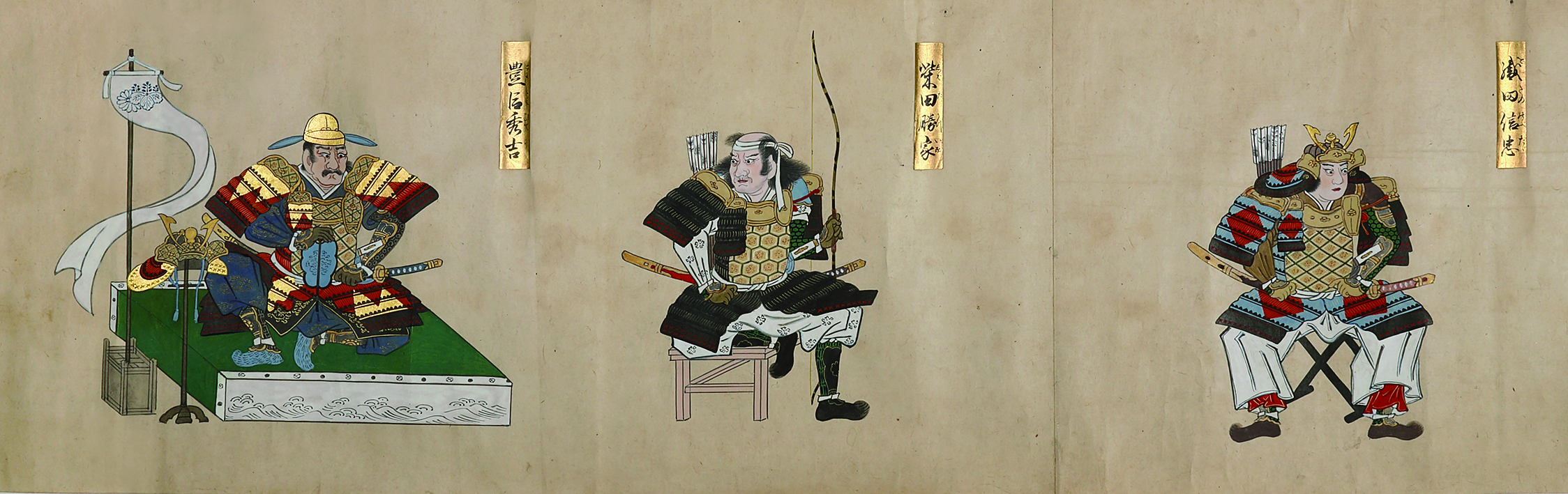 記紀に登場する道臣命から戦国期の豊臣秀吉に至るまでの著名な武将百人の姿を描く。武将の絵順やその構図は林羅山の作とされる『本朝百将伝』(明暦刊本)と共通するが、人物の表情や所持品、着衣の模様に至るまで、極彩色を用いて細部に亘り丁寧に描かれている。肖像画の右上に付された金紙には人名とその平仮名読みが墨書されている。奥書等はない。元と思われる函の蓋裏には「岡山池田侯爵家舊蔵」の紙片が貼付されており、当該品はそれに相応しい美しく豪華なつくりである。