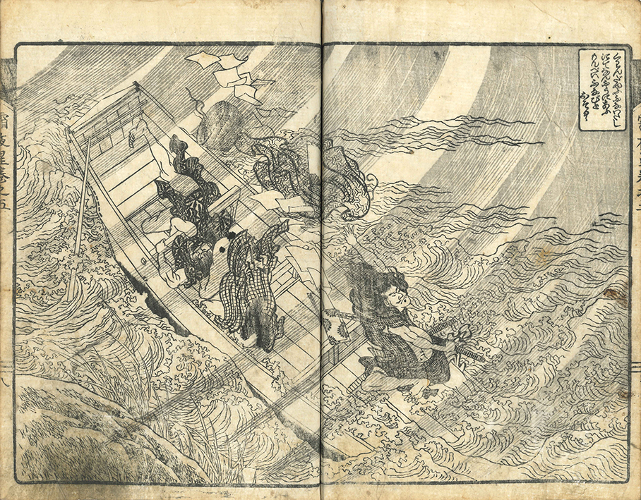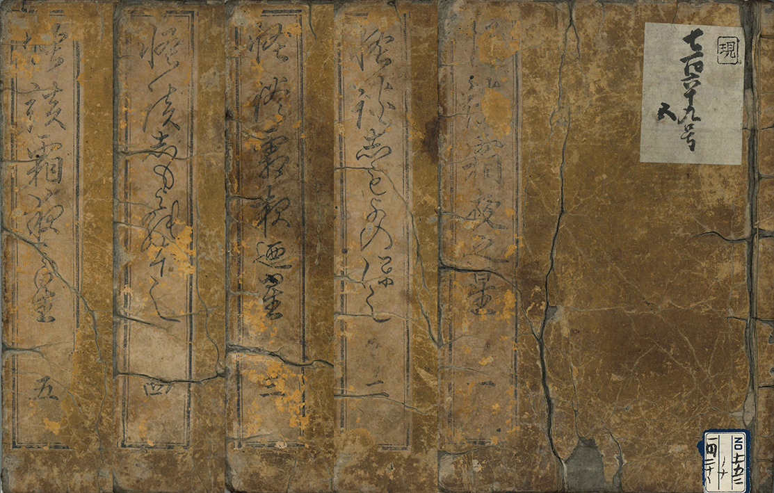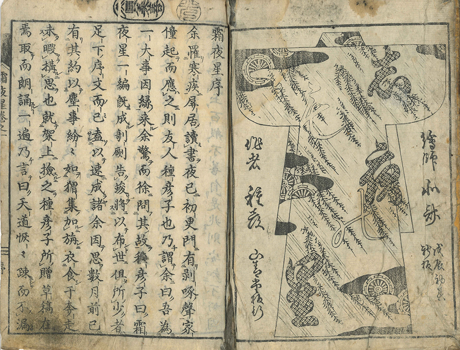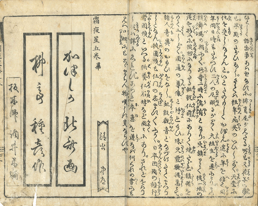 備考半紙本。元の支子色表紙(ツカレ有)に元題簽「怪談霜夜の星 一(三・五)」「怪談しもよのほし 二(四)」、絵入元見返し付、但し第二・三・四の各巻の見返し紙破れ。五巻末に『阿波鳴門』及び『総角物語』予告の入った三都四書肆名ある文化五年正月の刊記有(少傷み)。初刷本ではないが、挿絵の一部に薄墨刷又は砥粉刷入。惜しくも画中の顔部分数ヵ所に墨・擦痕がある。