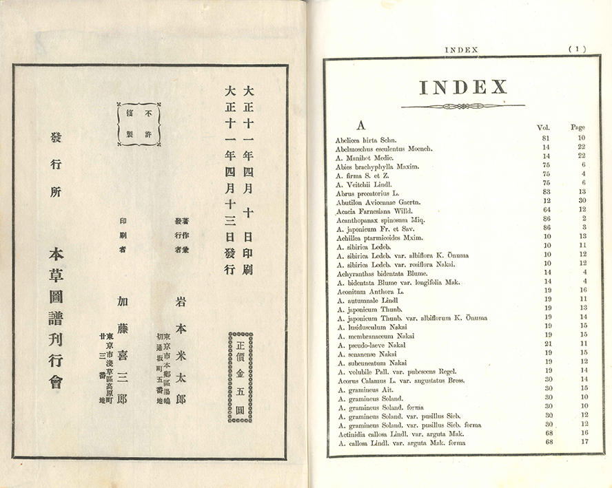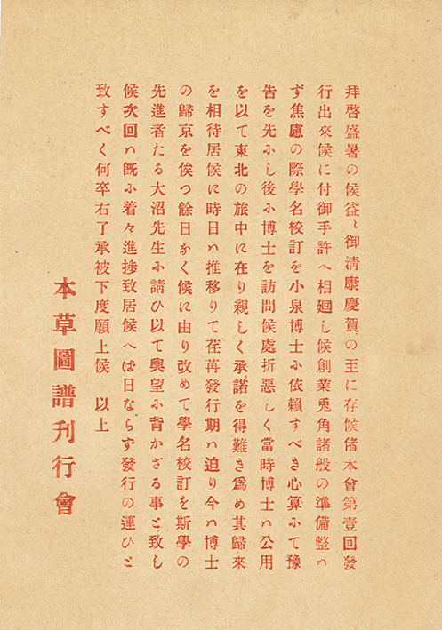 | 備考 | 美濃判、元の白茶色表紙に元題簽・元見返し付。わが国で最初の本格的な植物図鑑で、文政十一(一八二八)年に全九六巻(巻一~四は未完、九二冊)が完成した。このうち巻五から巻十までの山草・芳草部六冊が同十三年に出版されるも費用の面で以後かなわず、他の巻は原本を模写したものを予約制で希望者に配本したと云う。本書はそれから百年近く経た大正十一(一九二二)年に本草図譜刊行会により全冊の刊行が成されたもので、多色刷りの木版技術を駆使した精密で美しい図譜である。 |