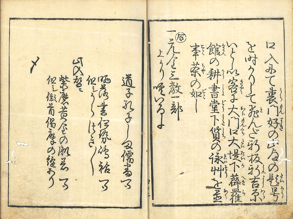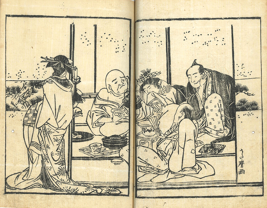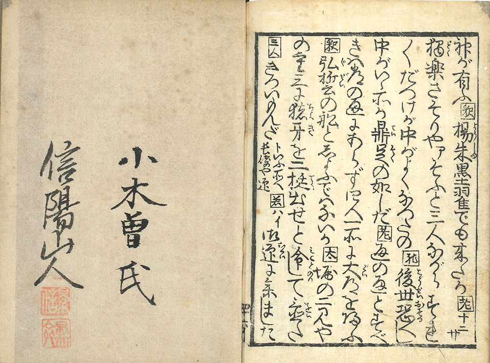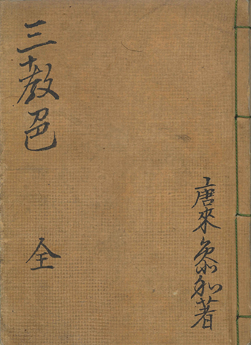 備考小本。改装布目空押模様黄土色表紙に「三教色 全」「唐来参和著」と打付け書き有。本文僅か虫食あるほかは保存良い。奥付は残っていないが、序・挿絵に覆刻版の特徴は有しない。裏見返しに「小木曽氏」「信陽山人(二顆朱印有)」の墨書き有。