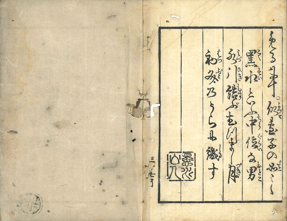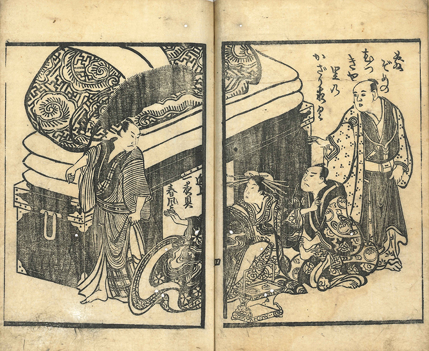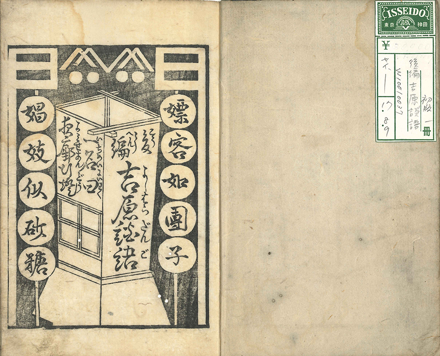備考小本。薄茶色元表紙に題簽の剥落跡あり。口絵一丁入。当該品は凡例の匡郭が上下双辺の初版。数丁に僅か水染み、喉に僅かな虫穴あるほかは刷、保存共良い。
