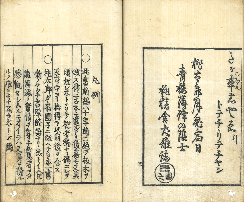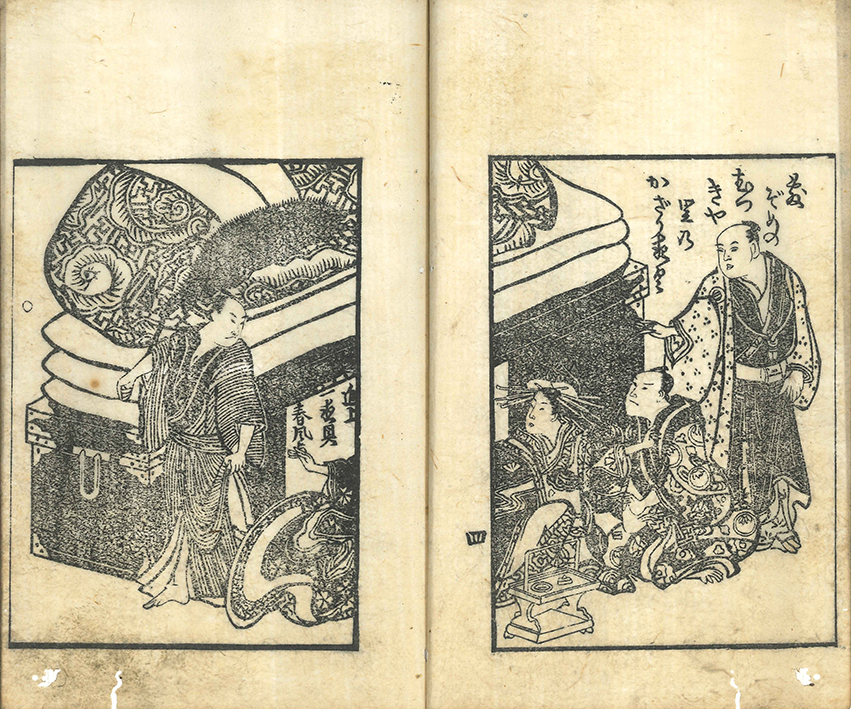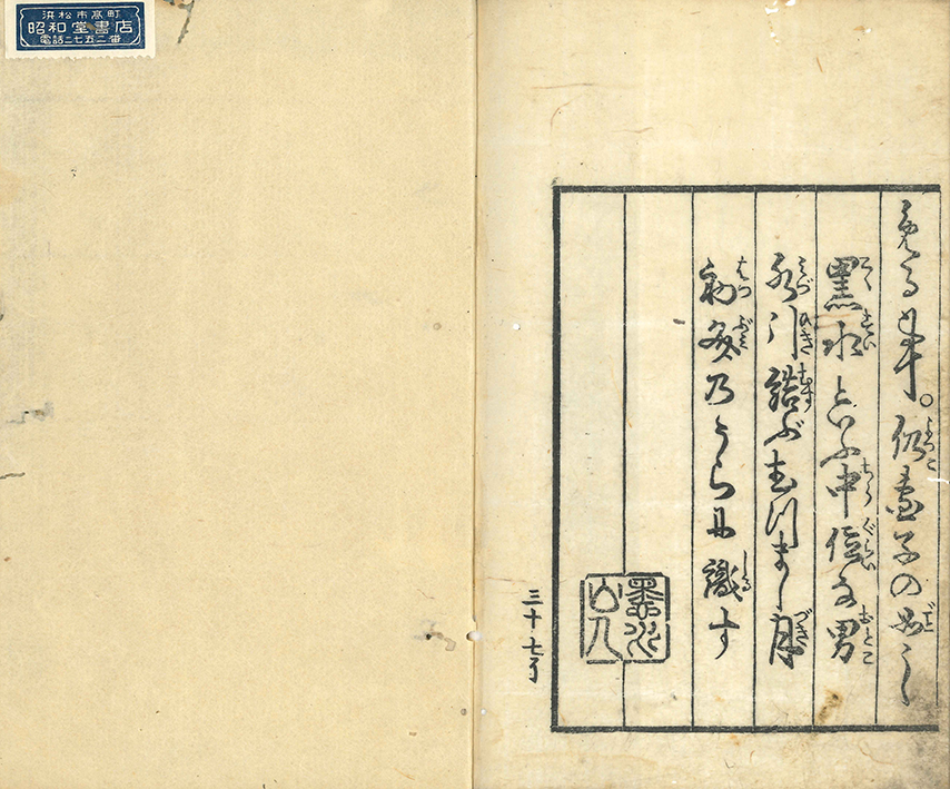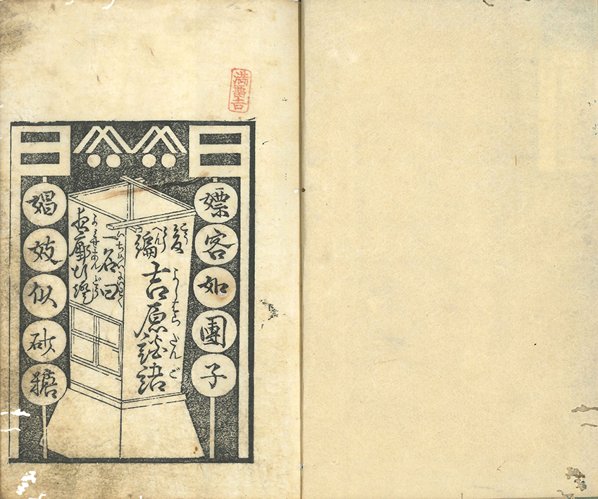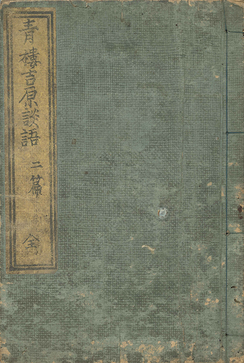 備考中本。元の布目模様水色表紙に黄色元題簽「青楼吉原談語 二篇 全」付。改刻の後版本で、前掲書のさらに後刷か。本文少虫食、下部僅か手擦れ有。「百樹の」(花岡百樹)他一顆旧蔵印有。