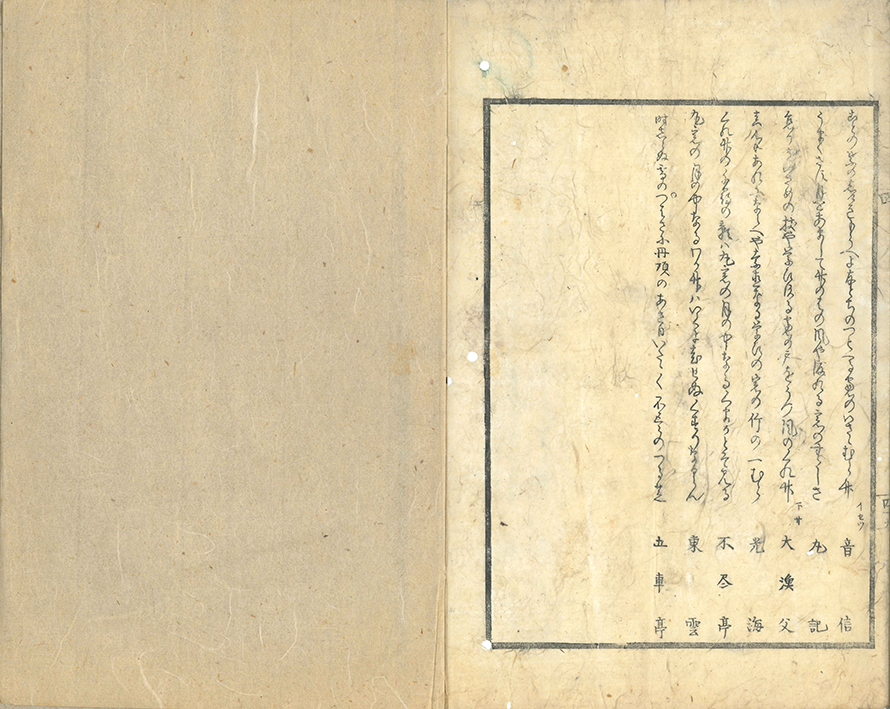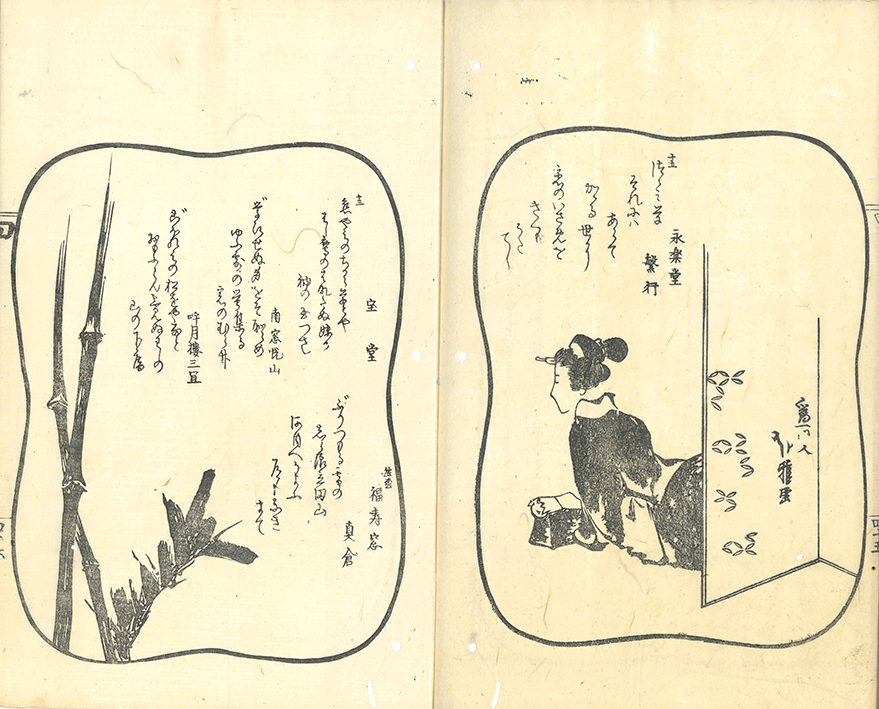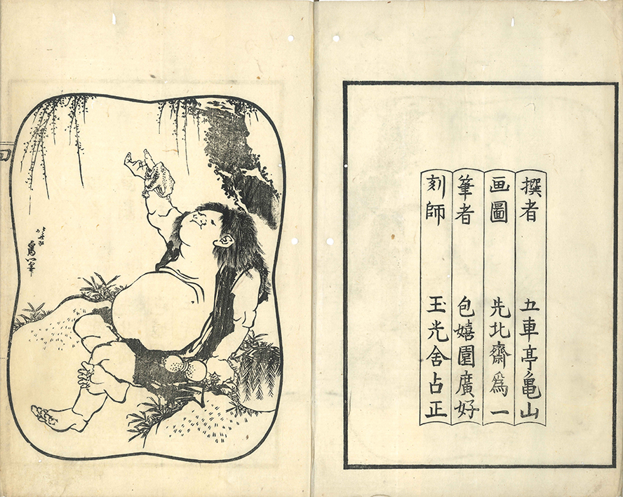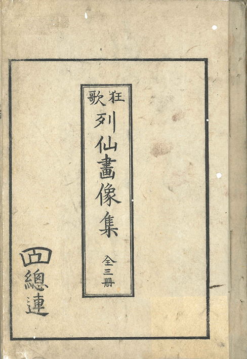 | 備考 | 仮綴じの半紙本。オモテに「狂/歌 列仙畫像集 全三冊/ ●總連」、ウラに「撰者 五車亭亀山/画圖 先北斎為一/筆者 包喜園廣好/刻師 玉光舎占正」と刷る共紙の表紙付。尚内題は「狂歌列仙傳」。丁付なくオモテに「北斎改/為一筆」と落款のある口絵一丁に続いて一~十・十二・十二・十三の丁付ある口絵、一~十一・十一~四十九の丁付ある本文(挿絵四丁を含む)よりなる。刊記はない。表紙ウラに「画圖 先北斎為一」と刷るも、口絵のうちの一図に「北雅筆」、又本文挿絵のうちの一図に「為一門人/北雅画」と落款があり、残る無款の絵十数図についても精査を要する。尚、各所に残る伝本は各々丁数や構成が異なっており、表紙に刻される「全三冊」の意味と共に研究が俟たれる。数丁に僅か虫食あるも刷り保存共ほぼ良。 |