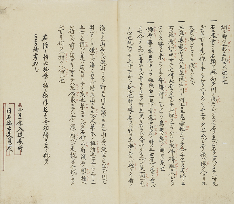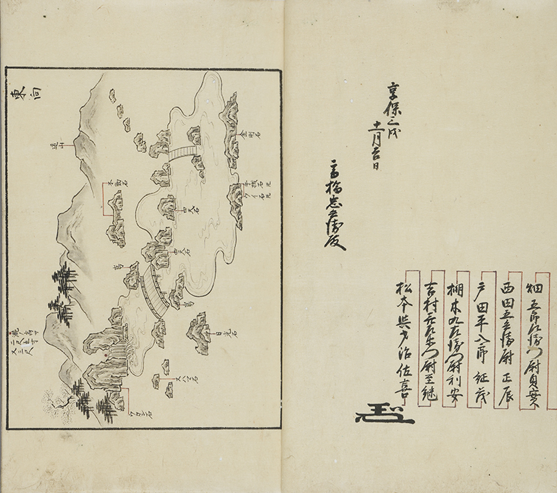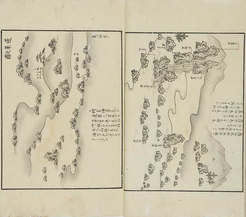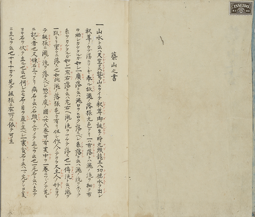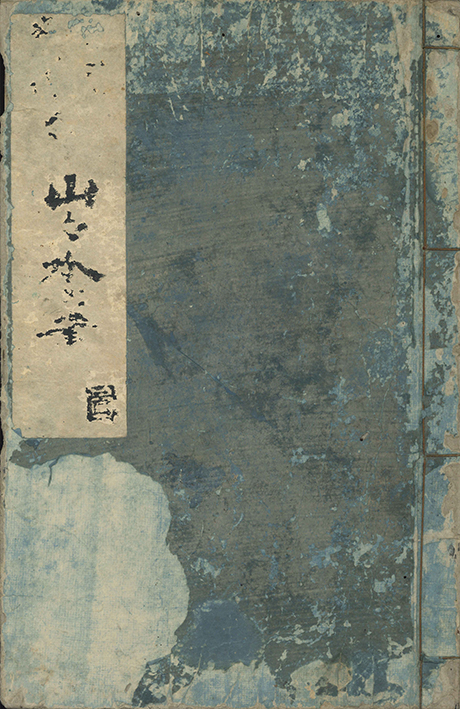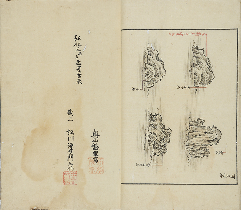 備考美濃判。薄藍色表紙(擦れ)に書題簽(擦れ有、「●(築カ)山々水書 圖」と読めるか)付。墨付全十丁、「築山之書」と題する享保三年高橋忠兵衛宛て伝書の写し四丁(漢字片仮名交じり文、語の一部に朱の振ガナあり)、「東向」「南向」「西向」「北向」「蓬莱吉」「蓬莱之圖」「満海之圖」「可忌石」の、薄墨を用い丁寧に描かれた各図六丁よりなる。裏見返しに「奥山盤里写 朱印(「平茂美印」)/弘化三丙午年吉辰 蔵主 松川源右エ門三伯 朱印(「森三伯」)」の奥書有。一部に薄い水染みあるも保存ほぼ良。書写者の奥山盤里は会津の絵師で萩原盤山の門に学んだ人物と云う。