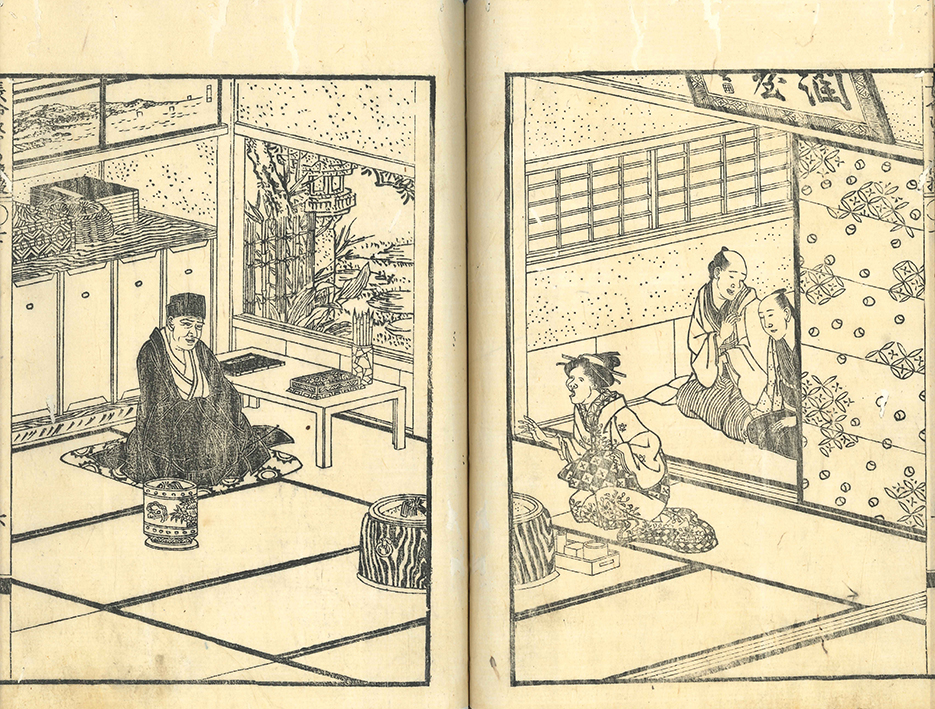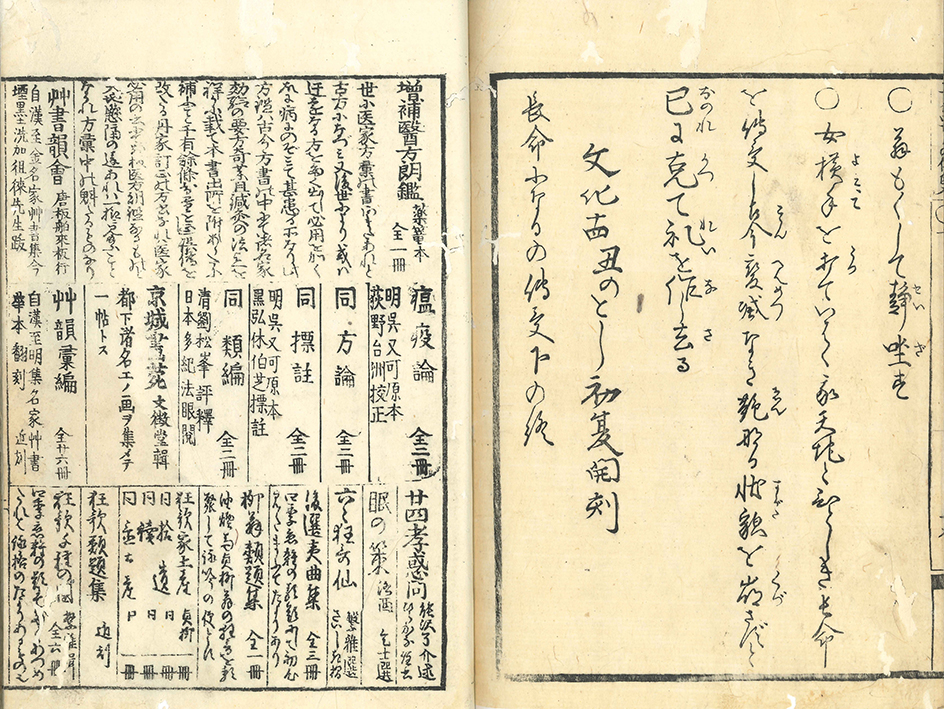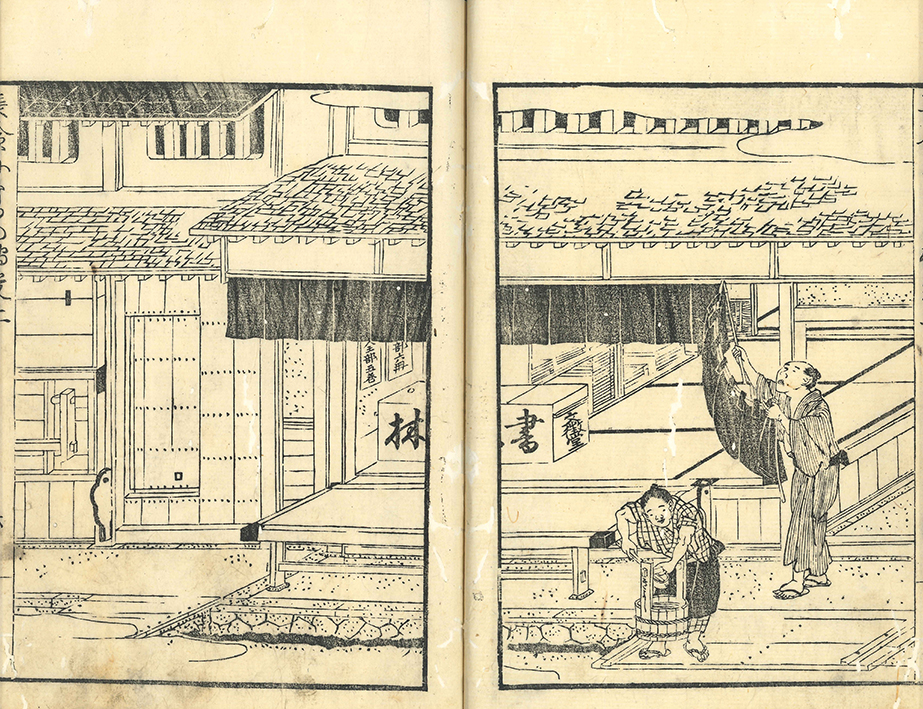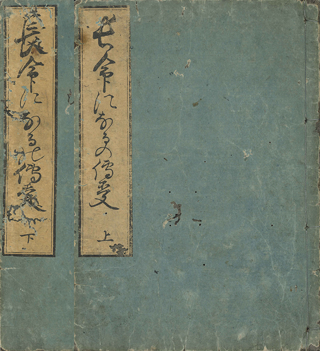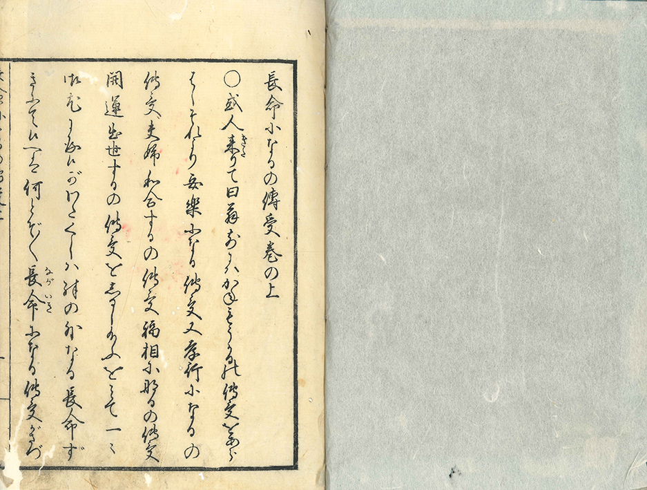 備考半紙本。元の薄藍色表紙に元題簽「長命になるの傳受 上(下)」、候補見返し紙付。本文虫食裏打補修済み。挿絵に版元文徴堂吉田屋新兵衛の店先を描いた一図あり。下巻末に蔵版目録二丁を有する。