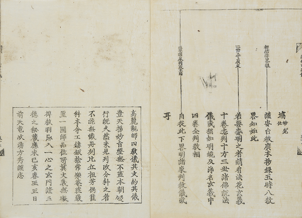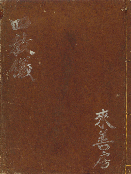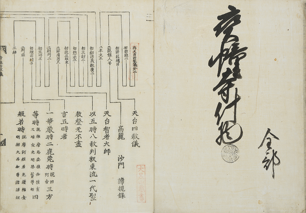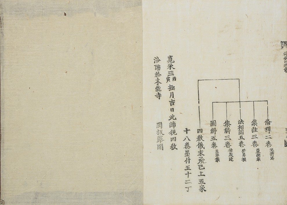 備考本の大きさ二八・三×二一・二糎。改装古い栗皮表紙左上に白墨で「四教儀」、また右下に同筆で「来善房」と書す。見返しに「宝幢寺什物(「大黒」の黒印あり)」の墨書、又巻頭に「大黒山蔵書」の旧蔵朱印があり出羽国山形宝幢寺のものか。本文全五十二丁、柱題「諦観四教儀」。保存良。末丁オモテに応永二十六年岐陽方秀による原刊記「高麗觀師四教儀其文約其儀/豊天梯妙㫖●(殸に正)無不盡本朝●(版カ)/行既久然未見列改分科之者/不能無懺丹州比丘祖芳偶●(觀カ)/科本命工鏤鈑捨常樂菴荘嚴/聖一國師品位所冀文義無礙/禅教羽忌入一心之玄門證三/徳之秘蔵應永己亥春王正日/前天竜岐陽方秀謹志」、又同ウラに「寛永三丙寅極月吉日此諦観四教/洛陽於本能寺  開板露閑」の刊記がある。本書は応永二十六年刊本を寛永三年に本能寺の露閑が覆刻刊行したものかと推察されうるも、応永版は現時点で伝本の存在を確認できない(『五山版の研究』解題一九四番に載る『天台四教儀集解』(伝本は建仁寺大中院蔵の一本のみと云う)に本書と同様の刊記があるらしいが不詳)。東福寺八十世、天龍寺六十四世、南禅寺九十七世を歴任、学問に秀でた岐陽方秀の思想・活動がうかがえる点でも注目される。