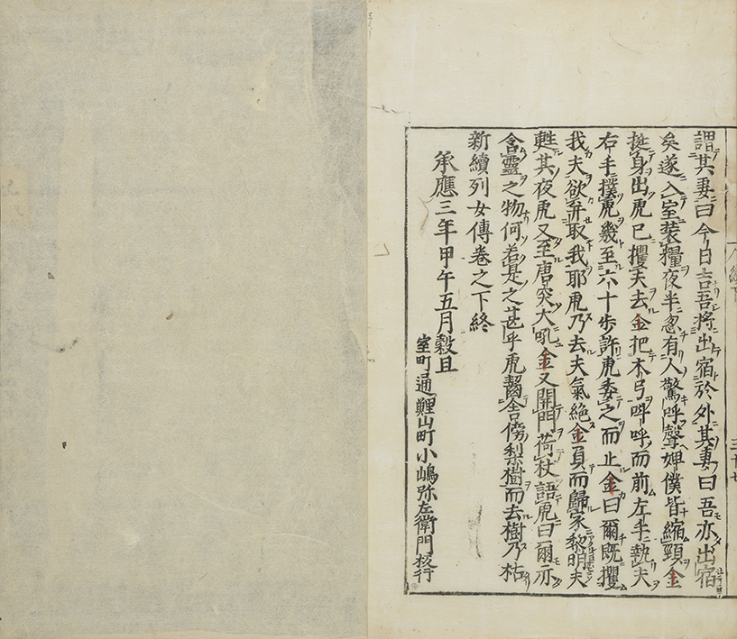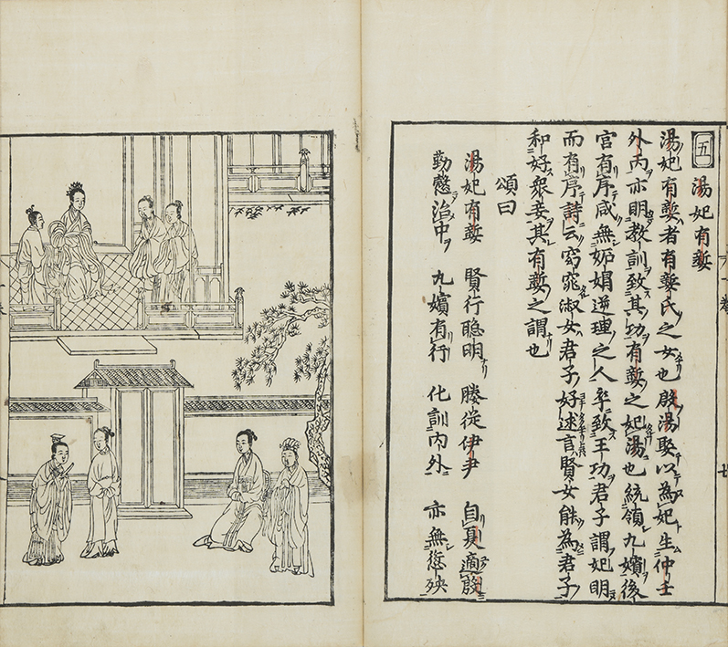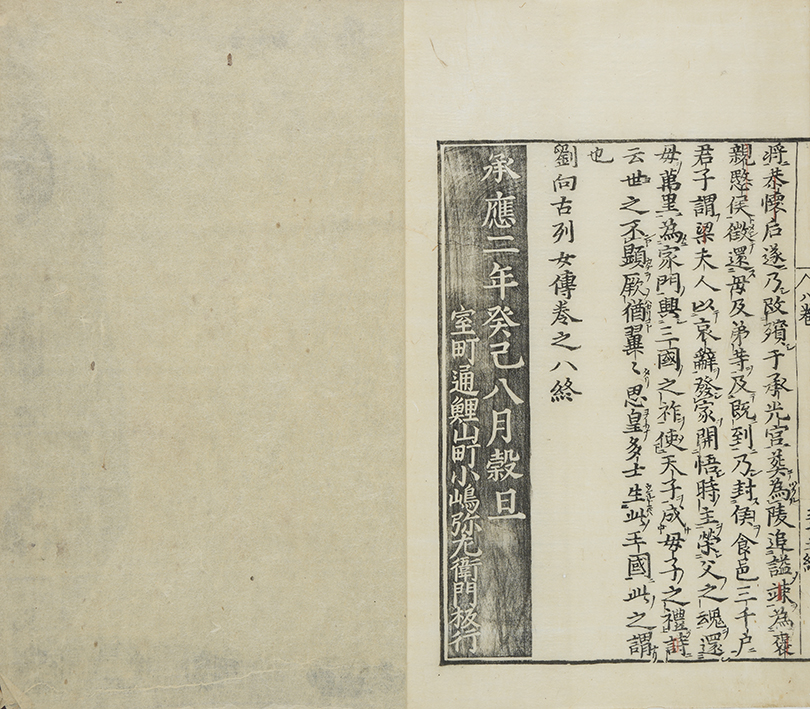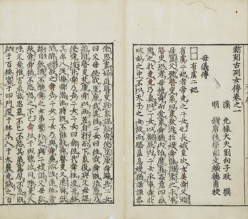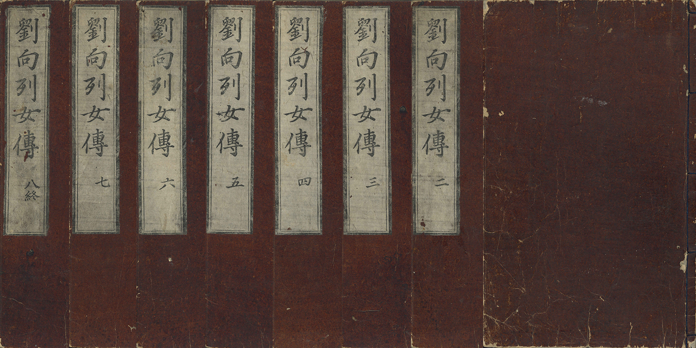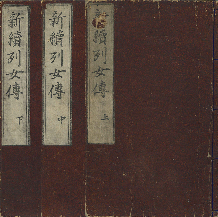 備考正編及び続編八冊(承応二年刊)、新続編三冊(同三年刊)よりなる。二七・七×一七・一糎の美濃判縦長本。元の栗皮表紙に元題簽「劉向列女傳 (一)~八終」(第一冊の一枚のみ欠)、及び「新續列女伝 上(中・下)」付。本文刷り・保存共良好。「南楚」のやや古い旧蔵黒印あり。