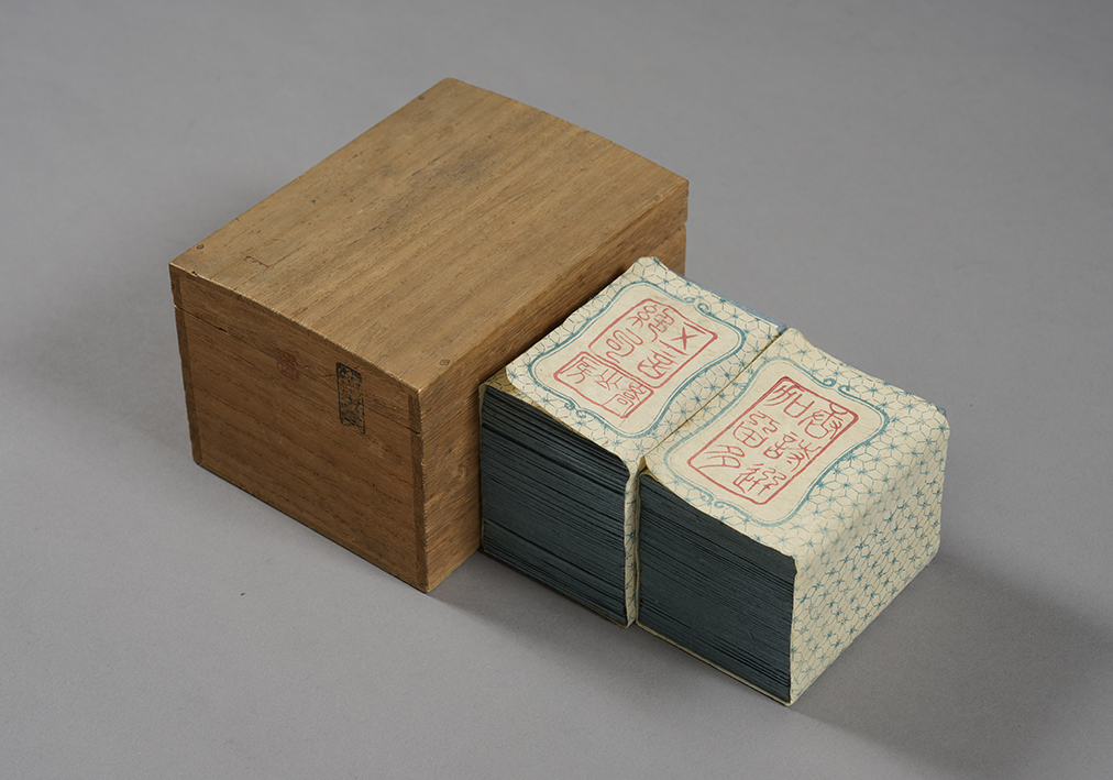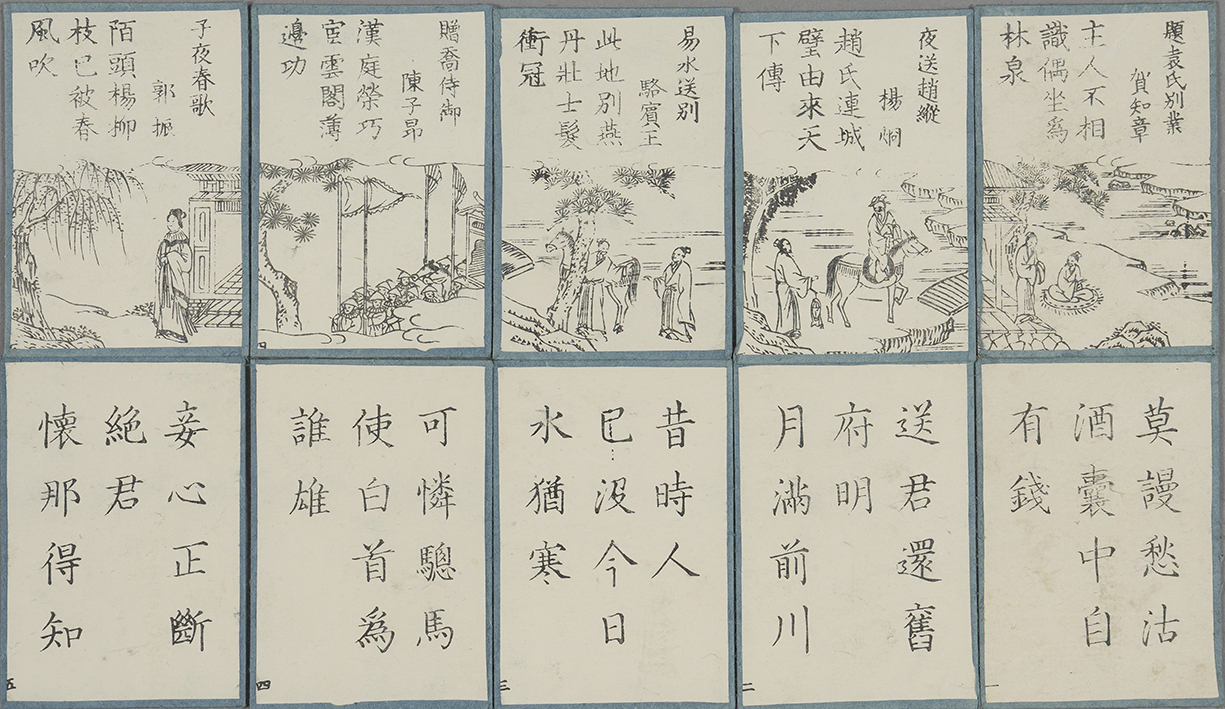 | 備考 | 札の大きさ八・二×五・六糎。読札には題・作者・起句承句と詩にちなんだ絵を、取札は転句結句を刻す。なお共に札の左下に小さく「一(~七四)」と番号を刻す。裏面は薄藍色。各七十四枚を束ねるための元包紙(藍刷模様入り、中央に「唐詩選加留多」及「五言絶句」「嵩山房」の刷印有)を付す。又箱の蓋と本体との接合面には朱印「嵩山」の割印が捺されており元箱であることがわかる(他にも四顆の朱印又は黒印有)。状態良好、元箱及元包紙を有する伝本は稀である。 |