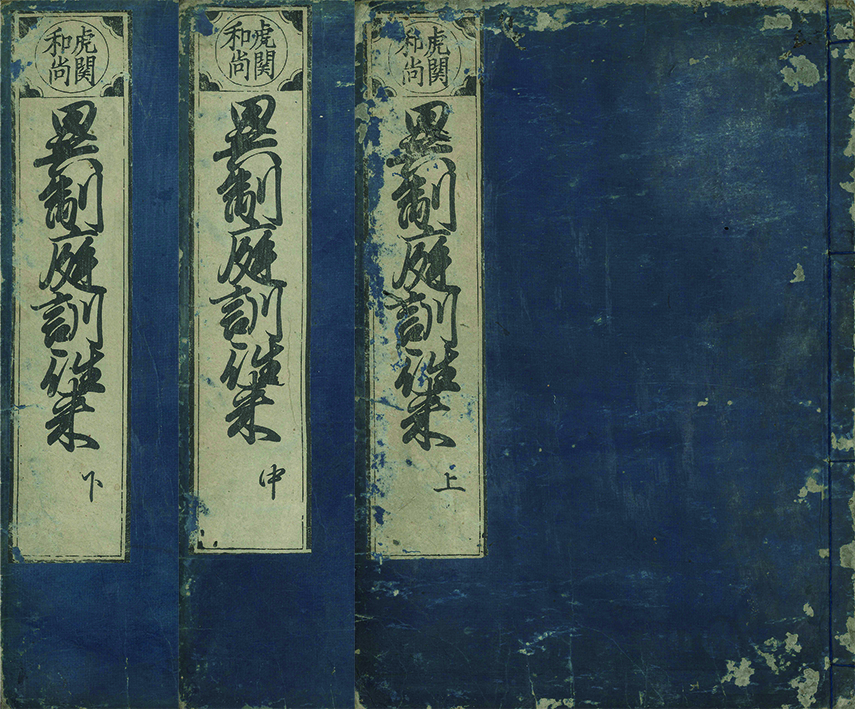 備考美濃判。元の藍色表紙に元題簽「虎関/和尚 異制庭訓往来 上(中・下)」完備。本文極僅か虫食、一部に少朱書入れあるも保存ほぼ良。南北朝時代の延文~応安間の成立と目され、現存最古写本は天文十四年『新撰之消息』。以後「百舌鳥往来」等様々な書名で伝写された。本書はその初の版行で、以来この「異制庭訓往来」の名で流布した。作者を虎関師錬とする東西軒の跋一丁を下巻末に持つ。伝本割と少ない。