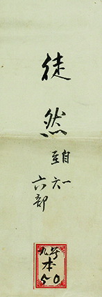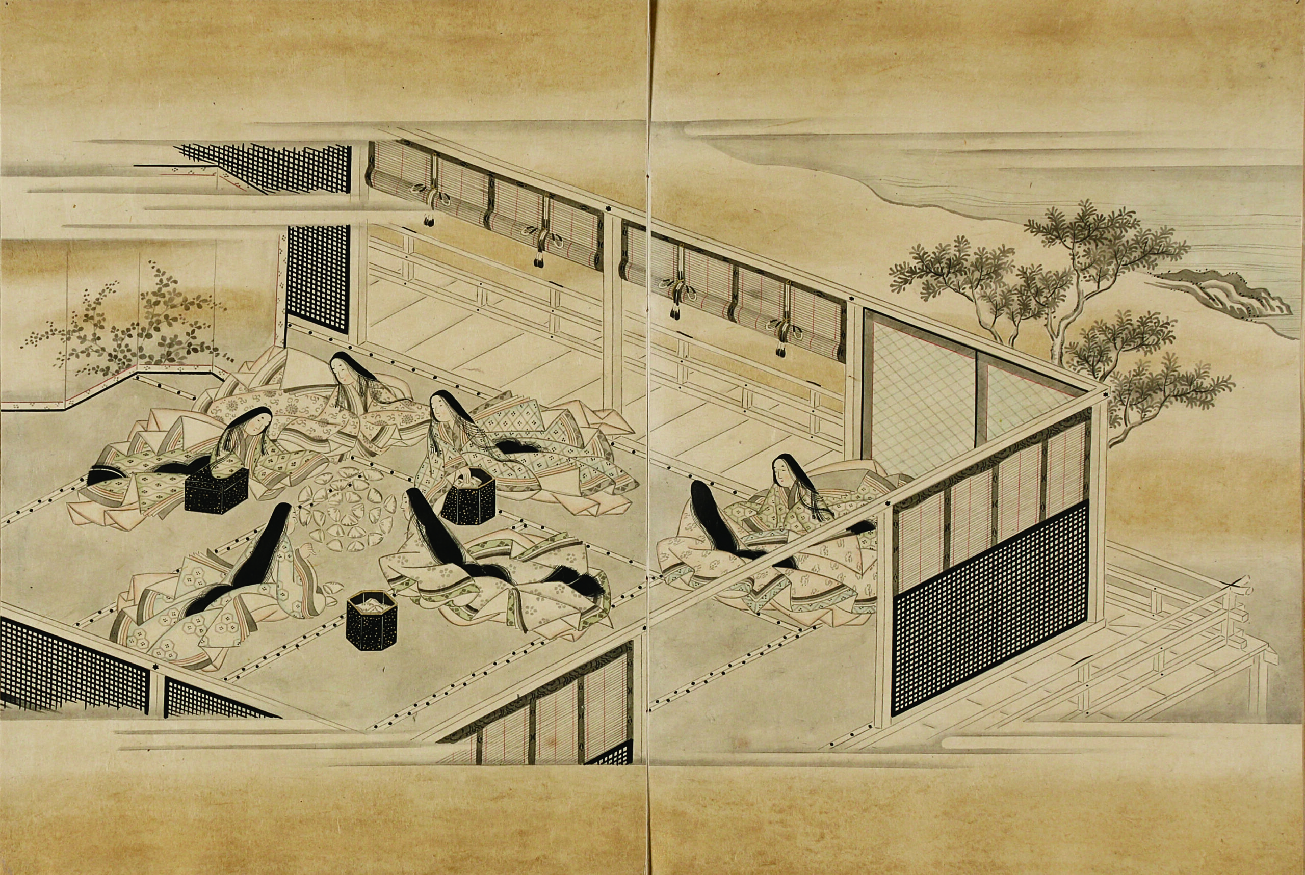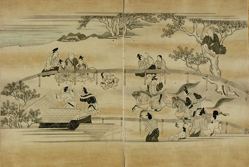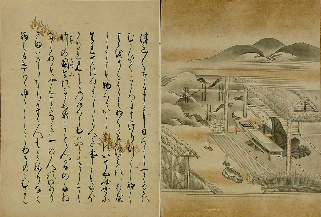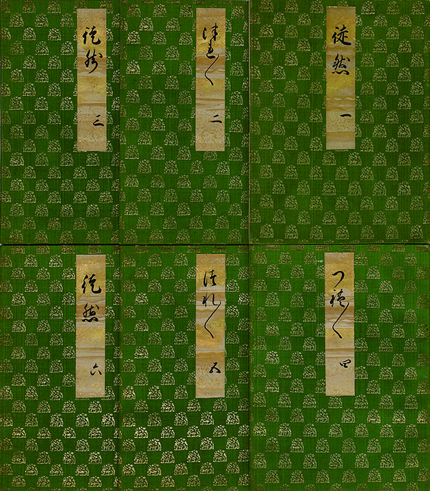 | 備考 | 大きさ二三・七×一七・六糎、綴葉装。萌黄色地の金襴表紙中央に金泥下絵入りの題簽「徒然(つれゝゝ) 一(~六)」、金紙見返し付。本文や遊び紙に金泥下絵入り料紙を用いるほか、挿絵面には薄い金泥雲霞引きを施している。毎半葉十行書き、章段毎に改行。内題、奥書ともなし。第一帖は第一段より第四十段、同二は第四十一段より第八十五段、同三は第八十六段より第百二十七段、同四は第百二十八段より第百六十七段、同五は第百六十八段より第二百五段、同六は第二百六段より第二百四十三段を収める全六帖仕立て。第二帖にのみノドに少虫食あるほかは保存良い。各帖には、薄墨のほか金泥・薄紅色・薄水縹色が細部の適所に用いられた美しい白描の挿絵が片面六~八図、見開き一図ずつ収められている。付属する二八×一〇糎の紙片には「徒然 自一/至六/ 六部」の墨書があり、同筆にて「九号/本/50」と記した赤い飾り枠のラベル貼付のあることより閑院宮家旧蔵と知れる。 |