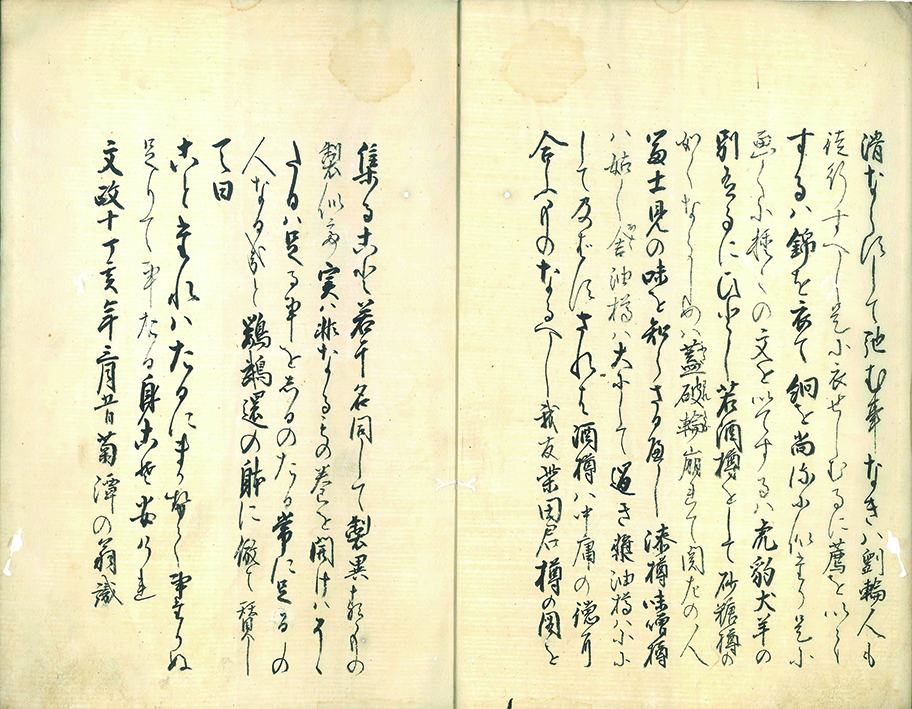 備考美濃判。玉子色表紙に「諸国酒樽之銘盡 全」の書題簽付。内題なし。本文墨付百二十二丁、数丁に少虫食あるも保存良い。
