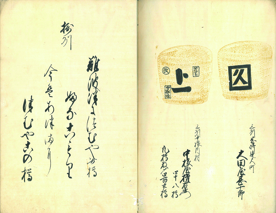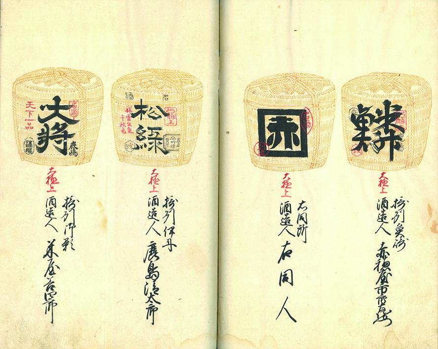 黄色で刷られた菰(薦、こも)樽図に墨及び朱で樽印の意匠を書き込み、地名と酒造人をその下に記す。一丁につき四図を配し、摂州二百二十七図、泉州二十図、播州一図、紀州七図、勢州二図、濃州二十二図、尾州九十九図、三州四十八図、合計四百二十六図を収める。このうち摂州の各図にのみ、「大極上」「極上」「上」「中」「下」、いずれかの評が朱で記されている。末に各国を読み込んだ酒の狂歌八首を付す。巻末の遊び紙に「干時天保七丙申年冬/従柴田元岱法眼借寫之」の書写奥書あり。尚、巻頭にある文政十年菊潭の翁(不詳)による序の文中に「柴田君樽の図を集る」とあり、原本所蔵者の「柴田元岱法眼」(不詳)と関連あるか。「大淀文庫蔵書記」の旧蔵朱印があり、山城国淀藩主稲葉家の旧蔵と思われる点も興味深い。『国書データベース』未掲載。