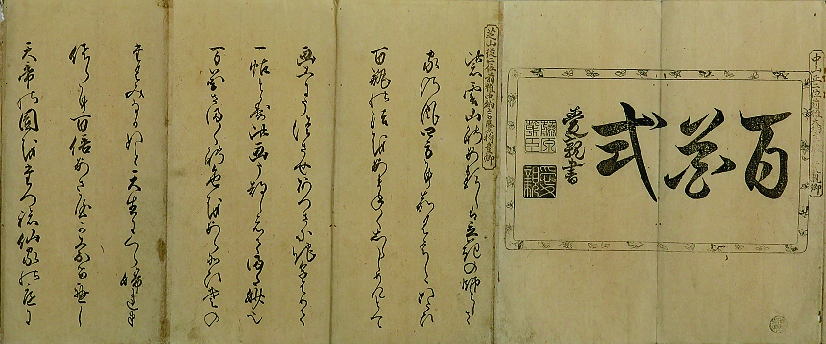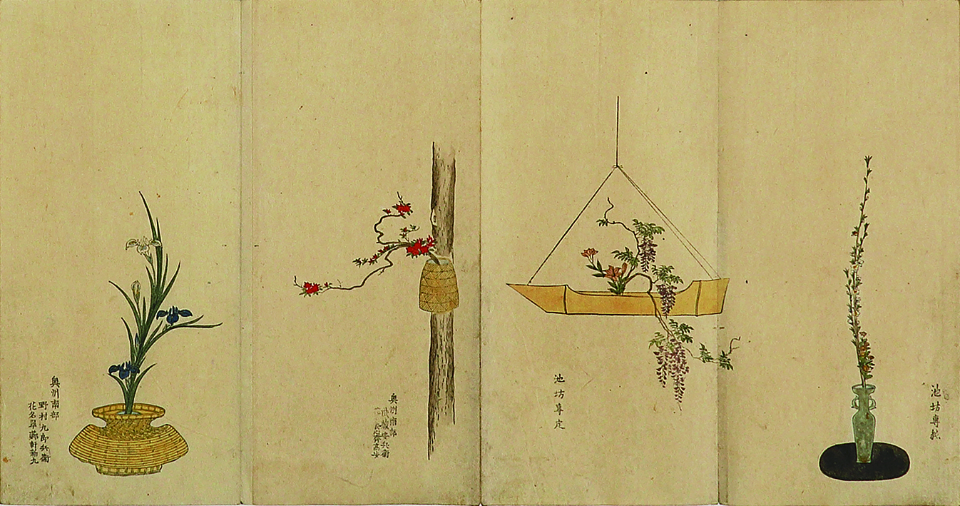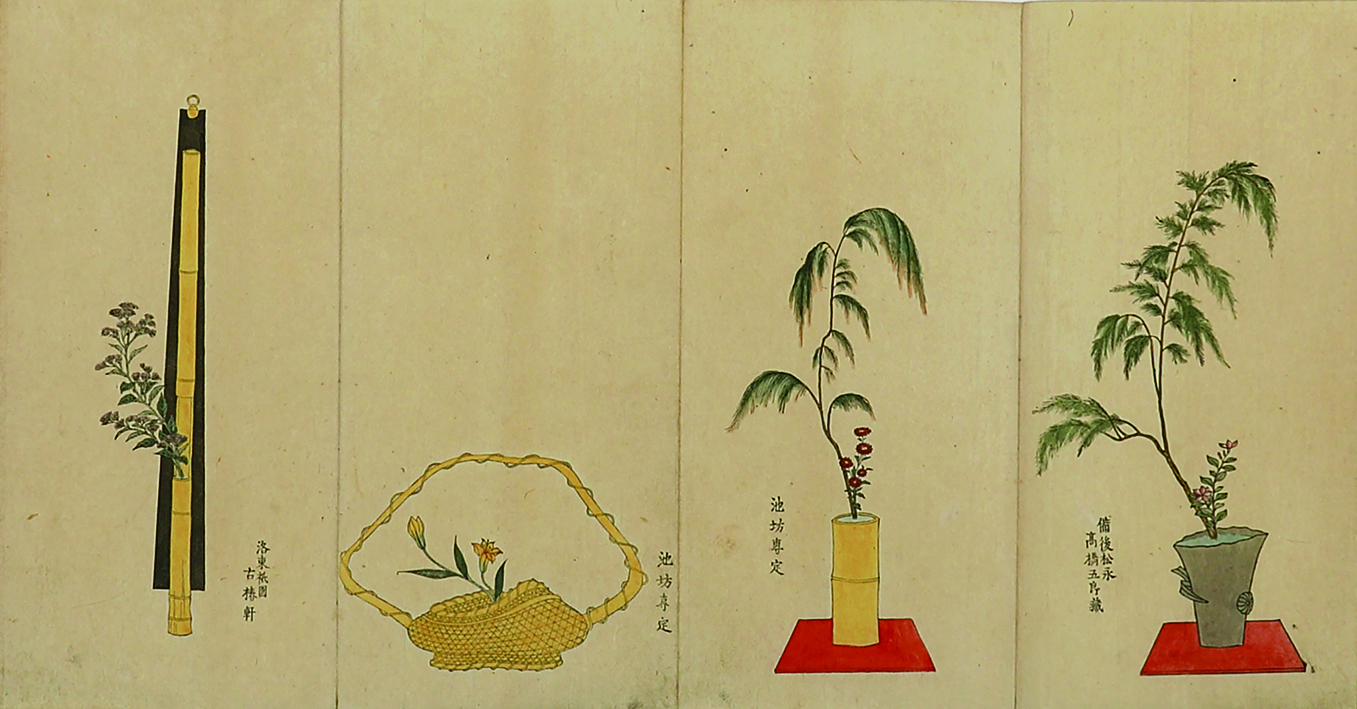 | 備考 | 帖の大きさ三〇・五×一四・五糎。元の梅茶色表紙(少虫食・擦れ有)中央に元題簽「根本生花百華式 前編」、薄藍色の元見返し付。中山愛親の題字、柴山持豊の序文に続き、池坊専定及び全国の門弟の作品百瓶の図を収める。図には丁寧な筆彩色が施されており、見るものを楽しませる。末に「紫雲山」「養雨」の朱印ある専定自跋あり。本文刷り良いが、一部少虫食有。古い塗箱に収まる。 池坊の「生花(しょうか)」の作品集として刊行された最初のもの。この五年後に後編の刊行されたことが知られるが、前・後共に伝本は多くない。 |