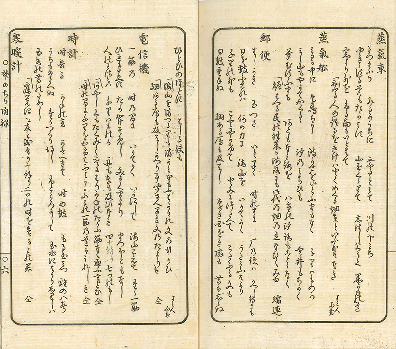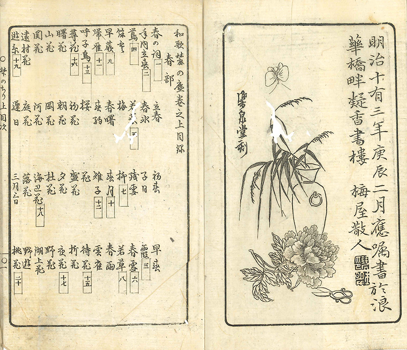 備考本の大きさ一二・八×八・六糎。元の水縹色絹表紙(一部少虫食、「佐藤蔵」(所用者不明)の大型朱印有)に元題簽「改正/増補 麓の塵 一(二) 四季(恋)」、紅色元見返し(少虫食)完備。口絵半丁入り。上巻巻頭の数丁に少虫食あるほかは保存ほぼ良。和歌実作のための歌書。寛政十二年初版の原著に、明治期の風俗趣向を反映させた題及び例歌を増補している。