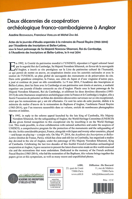 Deux Decennies de Cooperation Archeologique Franco-Cambodgienne a Angkor. Actes de la journee d’etudes organisee a la memoire de Pascal Royere par Academie des Inscriptions et Belles-Lettres, sous le haut patronage de Sa Majeste Norodom Sihamoni, Roi du Cambodge a l’Academie des Inscriptions et Belles-Lettres le 9 mai 2014.